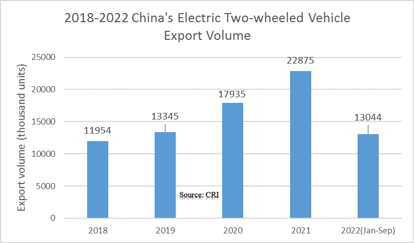 In 2021, China exported 22.875 million electric two-wheelers, up 27.5% year-on-year, and exported US$5.28 billion, up 50.7% year-on-year. According to CRI’s analysis, in the first three quarters of 2022, China exported 13.044 million electric two-wheelers, down 22.6% year-on-year, and exported US$4.23 billion, up 9.3% year-on-year.
