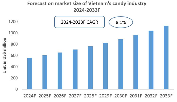 CRI forecasts that Vietnam’s candy industry will continue to grow, with the market size expected to reach US$ 1.13 billion by 2033, with a compound annual growth rate (CAGR) of 8.1% from 2024 to 2033.