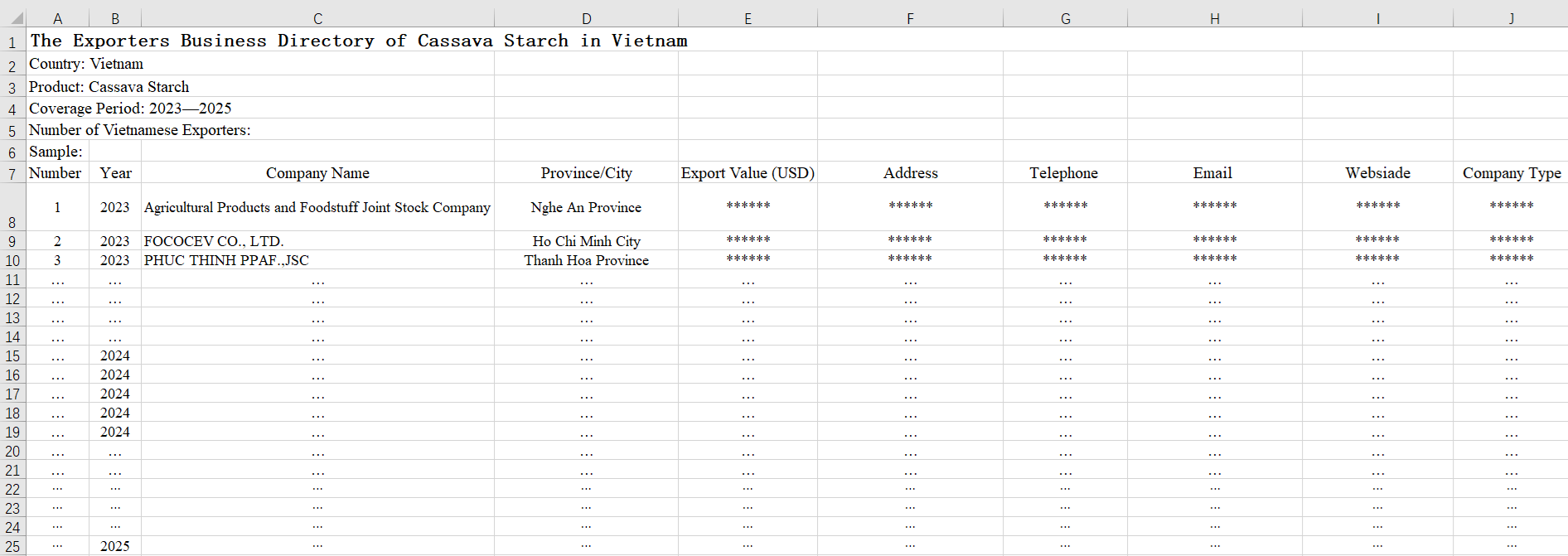 To help global food processing and sugar buyers, beverage and sugar industry buyers, paper and textile manufacturers, traders, and cross-border supply chain management companies more efficiently connect with the Vietnamese market, CRI launches the 2023-2025 Vietnam Cassava Starch Exporters Business Directory. This directory covers hundreds of Vietnamese Cassava Starch exporters from 2023 to 2025, including local cassava starch processing companies, multinational agricultural product suppliers, agricultural product export wholesalers and professional traders. The content includes important information such as company name, address, contact information, annual export value, etc. It supports EXCEL format, which is convenient for screening, classification and batch contact at any time.