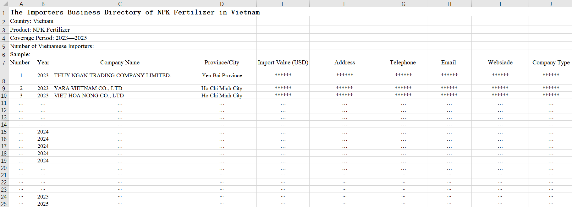 The publication of the 2023-2025 Vietnam NPK Fertilizer Importers Business Directory aims to provide fertilizer suppliers with precise customer resources and market access, reducing customer development costs and accelerating their entry into the Vietnamese market. It also serves as a first-hand reference for investment research, market layout, and strategic decision-making. Through this directory, global fertilizer manufacturers and exporters can quickly identify potential partners and fully grasp the latest trends and development opportunities in the Vietnamese NPK fertilizer market.